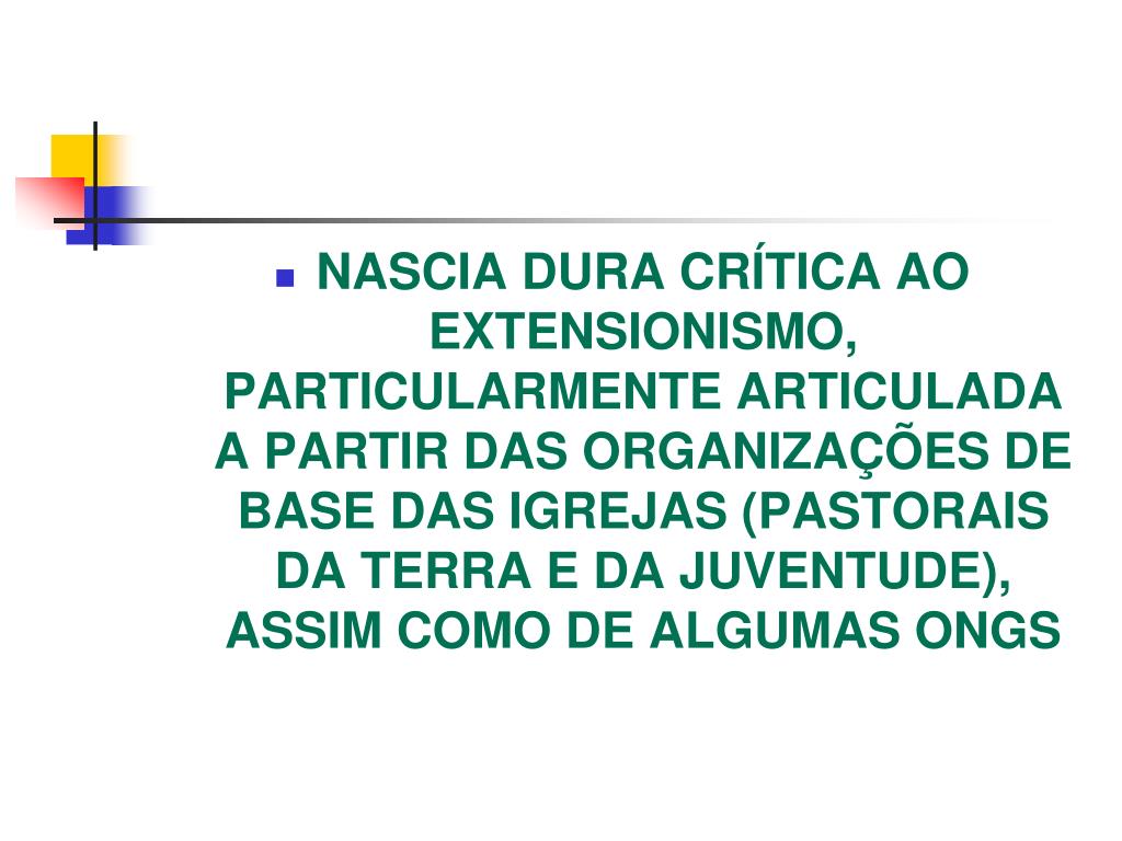 NASCIA DURA CRÍTICA AO EXTENSIONISMO, PARTICULARMENTE ARTICULADA A PARTIR DAS ORGANIZAÇÕES DE BASE DAS IGREJAS (PASTORAIS DA TERRA E DA JUVENTUDE), ASSIM COMO DE ALGUMAS ONGS