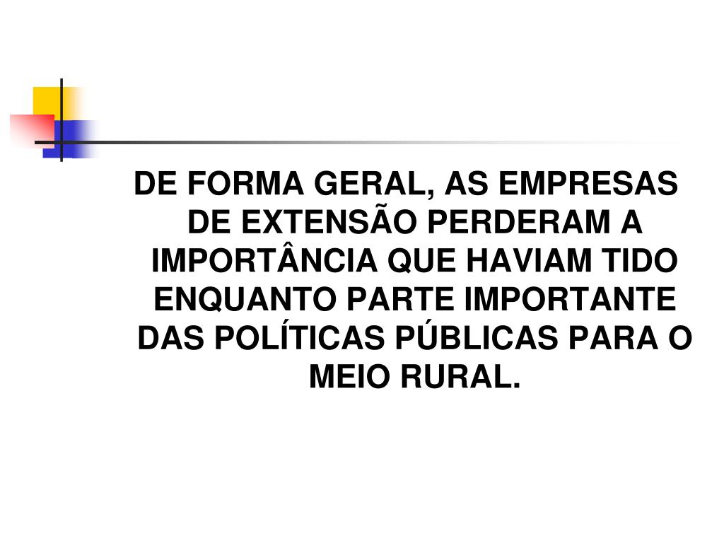 DE FORMA GERAL, AS EMPRESAS DE EXTENSÃO PERDERAM A IMPORTÂNCIA QUE HAVIAM TIDO ENQUANTO PARTE IMPORTANTE DAS POLÍTICAS PÚBLICAS PARA O MEIO RURAL.