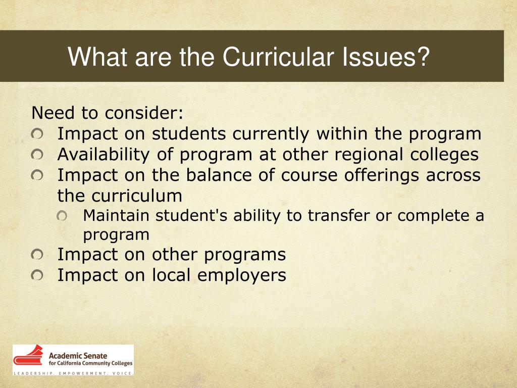 What are the Curricular Issues? Need to consider: • Impact on students currently within the program • Availability of program at other regional colleges • Impact on the balance of course offerings across the curriculum • Maintain student's ability to transfer or complete a program • Impact on other programs • Impact on local employers