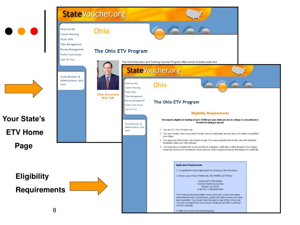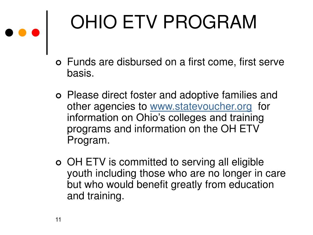 OHIO ETV PROGRAM • Funds are disbursed on a first come, first serve basis. • Please direct foster and adoptive families and other agencies to www.statevoucher.org for information on Ohio’s colleges and training programs and information on the OH ETV Program. • OH ETV is committed to serving all eligible youth including those who are no longer in care but who would benefit greatly from education and training.