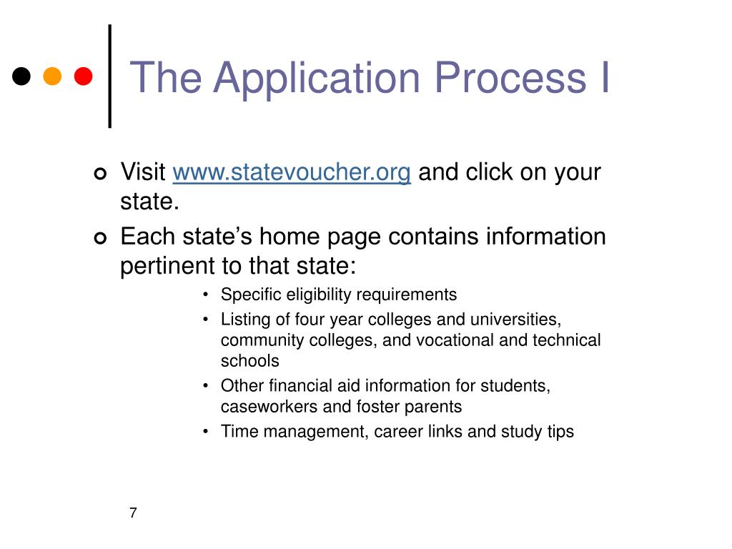 The Application Process I • Visit www.statevoucher.org and click on your state. • Each state’s home page contains information pertinent to that state: • Specific eligibility requirements • Listing of four year colleges and universities, community colleges, and vocational and technical schools • Other financial aid information for students, caseworkers and foster parents • Time management, career links and study tips