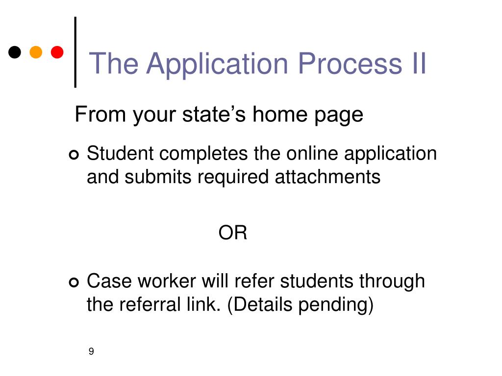 The Application Process II From your state’s home page • Student completes the online application and submits required attachments OR • Case worker will refer students through the referral link. (Details pending)