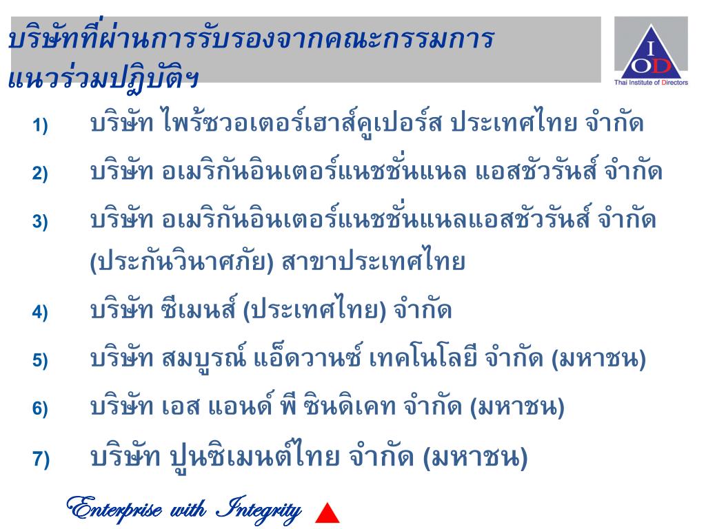 บริษัทที่ผ่านการรับรองจากคณะกรรมการบริษัทที่ผ่านการรับรองจากคณะกรรมการ แนวร่วมปฎิบัติฯ บริษัท ไพร้ซวอเตอร์เฮาส์คูเปอร์ส ประเทศไทย จำกัด บริษัท อเมริกันอินเตอร์แนชชั่นแนล แอสชัวรันส์ จำกัด บริษัท อเมริกันอินเตอร์แนชชั่นแนลแอสชัวรันส์ จำกัด (ประกันวินาศภัย) สาขาประเทศไทย บริษัท ซีเมนส์ (ประเทศไทย) จำกัด บริษัท สมบูรณ์ แอ็ดวานซ์ เทคโนโลยี จำกัด (มหาชน) บริษัท เอส แอนด์ พี ซินดิเคท จำกัด (มหาชน) บริษัท ปูนซิเมนต์ไทย จำกัด (มหาชน)