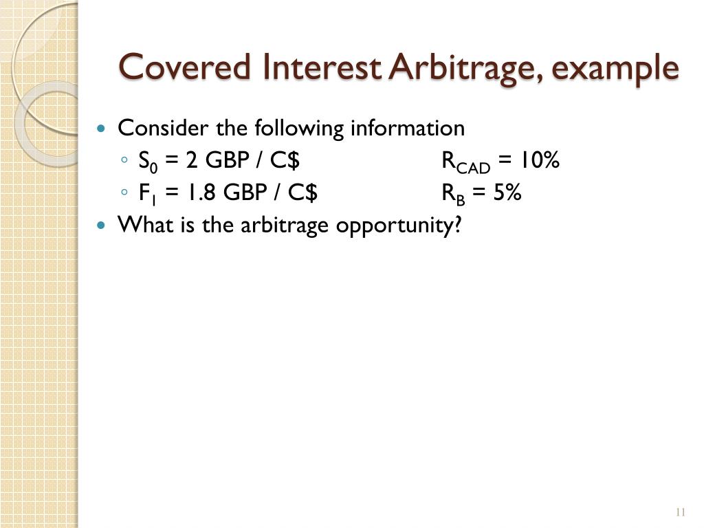 Covered Interest Arbitrage, example • Consider the following information • S0 = 2 GBP / C$ RCAD = 10% • F1 = 1.8 GBP / C$ RB = 5% • What is the arbitrage opportunity?