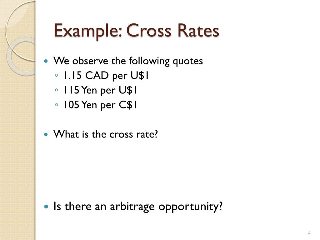 Example: Cross Rates • We observe the following quotes • 1.15 CAD per U$1 • 115 Yen per U$1 • 105 Yen per C$1 • What is the cross rate? • Is there an arbitrage opportunity?