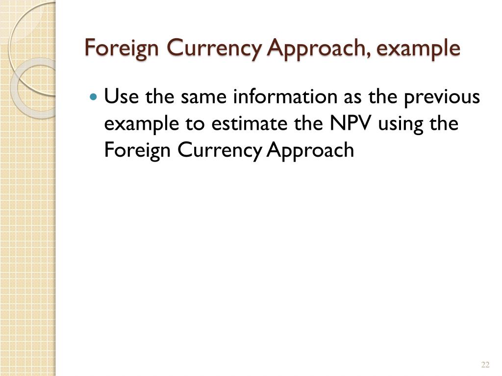 Foreign Currency Approach, example • Use the same information as the previous example to estimate the NPV using the Foreign Currency Approach