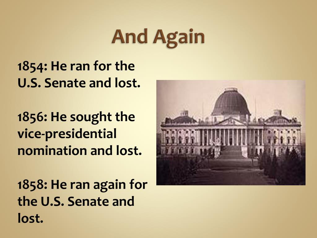 And Again 1854: He ran for the U.S. Senate and lost. 1856: He sought the vice-presidential nomination and lost. 1858: He ran again for the U.S. Senate and lost.