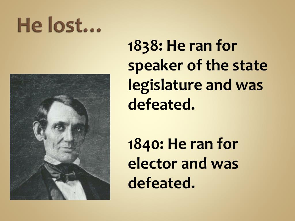 He lost… 1838: He ran for speaker of the state legislature and was defeated. 1840: He ran for elector and was defeated.