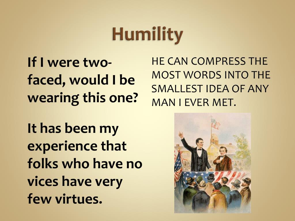 Humility He can compress the most words into the smallest Idea of any man I ever met. If I were two-faced, would I be wearing this one? It has been my experience that folks who have no vices have very few virtues.