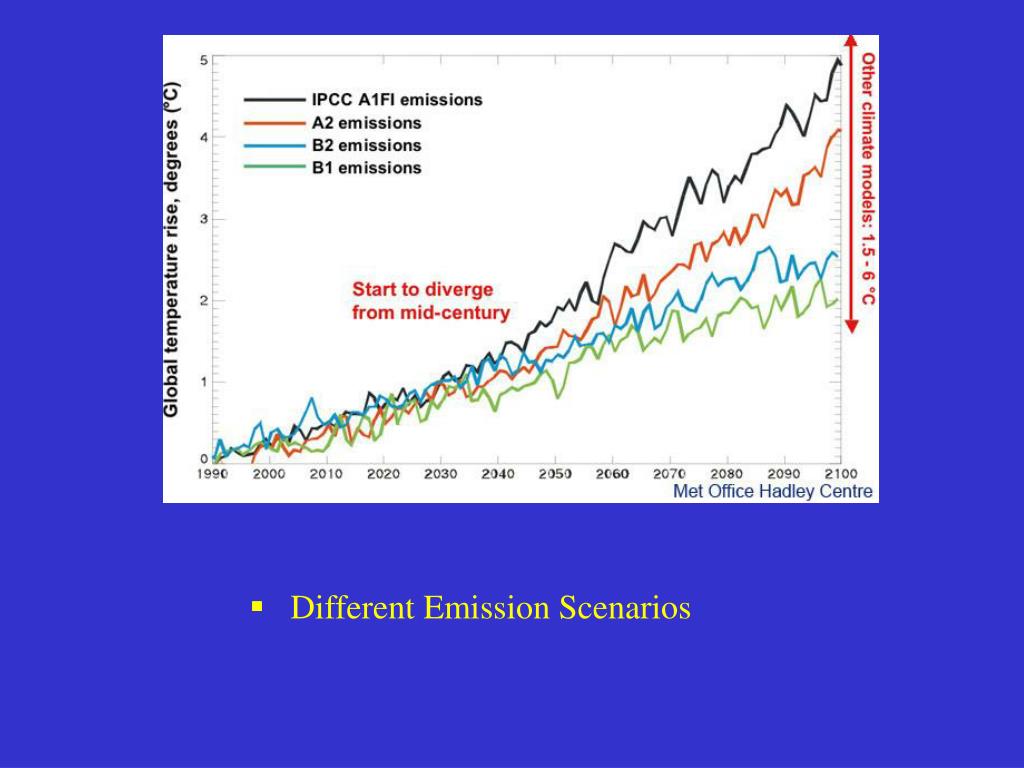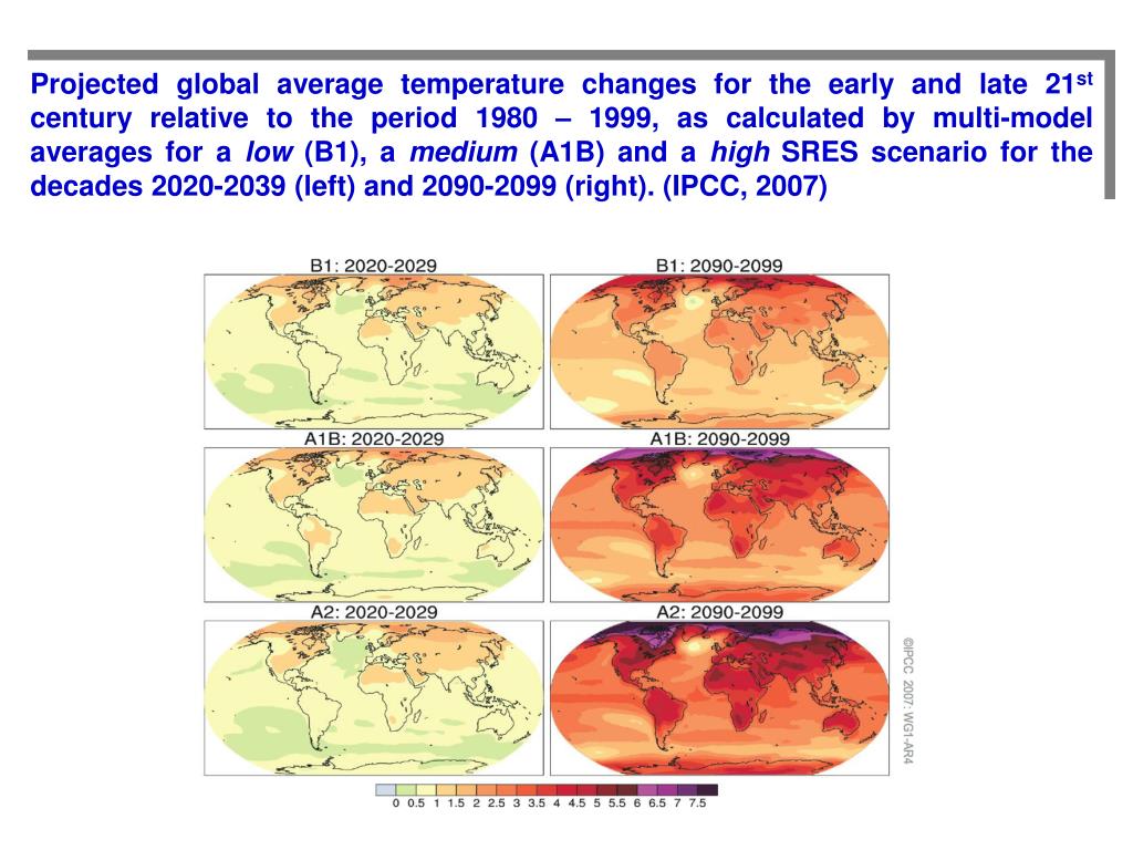 Projected global average temperature changes for the early and late 21st century relative to the period 1980 – 1999, as calculated by multi-model averages for a low (B1), a medium (A1B) and a high SRES scenario for the decades 2020-2039 (left) and 2090-2099 (right). (IPCC, 2007)