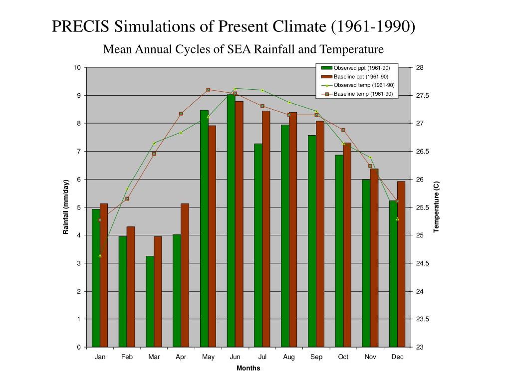 PRECIS Simulations of Present Climate (1961-1990) Mean Annual Cycles of SEA Rainfall and Temperature