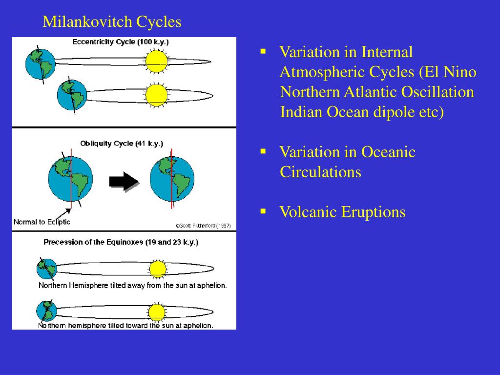Milankovitch Cycles • Variation in Internal Atmospheric Cycles (El Nino Northern Atlantic Oscillation Indian Ocean dipole etc) • Variation in Oceanic Circulations • Volcanic Eruptions