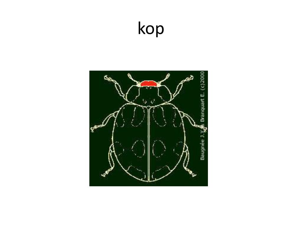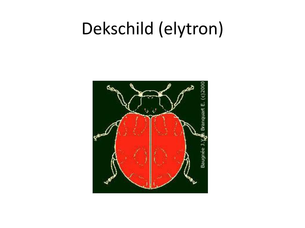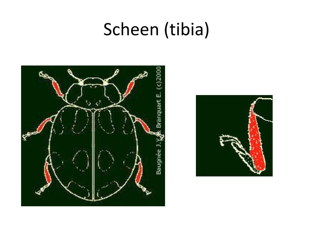 Determineren van lieveheersbeestjes. kop. Halsschild ( pronotum ). Schildje ( scutellum ). schildnaad. Dekschild ( elytron ). Dij (femur). Scheen ( tibia ). Tars (of voet). Heup (of coxa). Dijlijn.