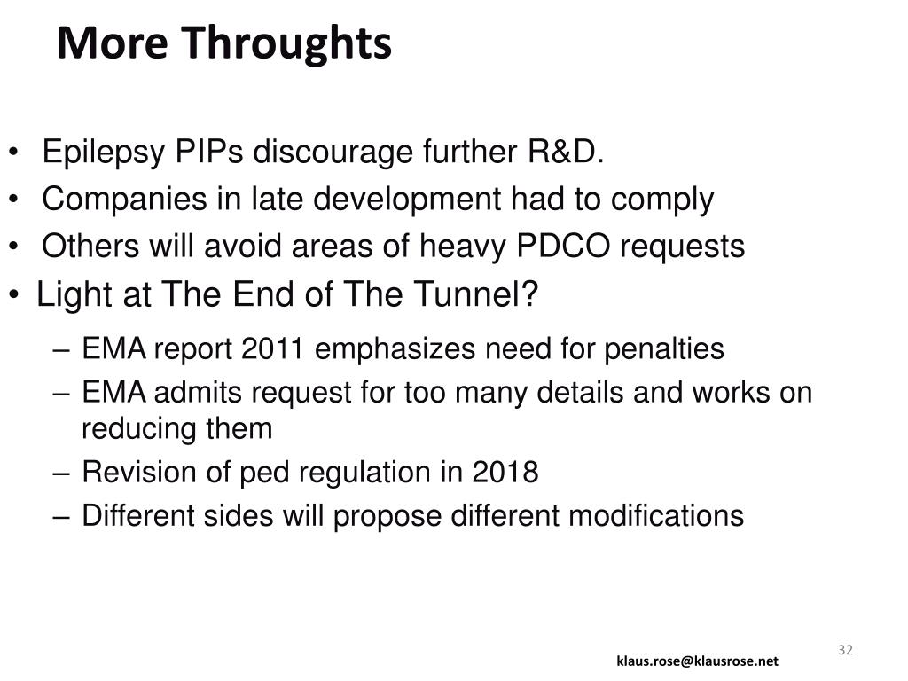 More Throughts • Epilepsy PIPs discourage further R&D. • Companies in late development had to comply • Others will avoid areas of heavy PDCO requests • Light at The End of The Tunnel? • EMA report 2011 emphasizes need for penalties • EMA admits request for too many details and works on reducing them • Revision of ped regulation in 2018 • Different sides will propose different modifications klaus.rose@klausrose.net