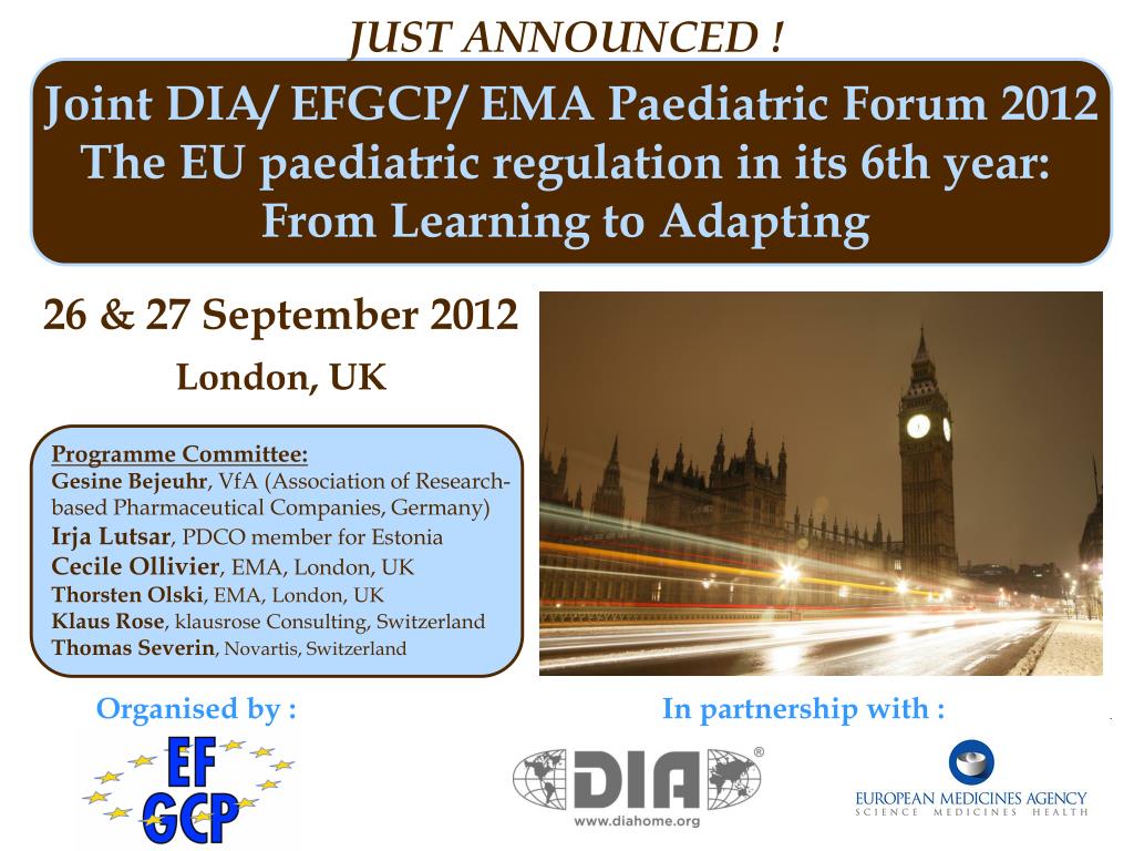 Programme Committee: Gesine Bejeuhr, VfA (Association of Research-based Pharmaceutical Companies, Germany) Irja Lutsar, PDCO member for Estonia Cecile Ollivier, EMA, London, UK Thorsten Olski, EMA, London, UK Klaus Rose, klausrose Consulting, Switzerland Thomas Severin, Novartis, Switzerland JUST ANNOUNCED ! Joint DIA/ EFGCP/ EMA Paediatric Forum 2012 The EU paediatric regulation in its 6th year: From Learning to Adapting 26 & 27 September 2012 London, UK Organised by : In partnership with : For further information, please visit www.efgcp.eu
