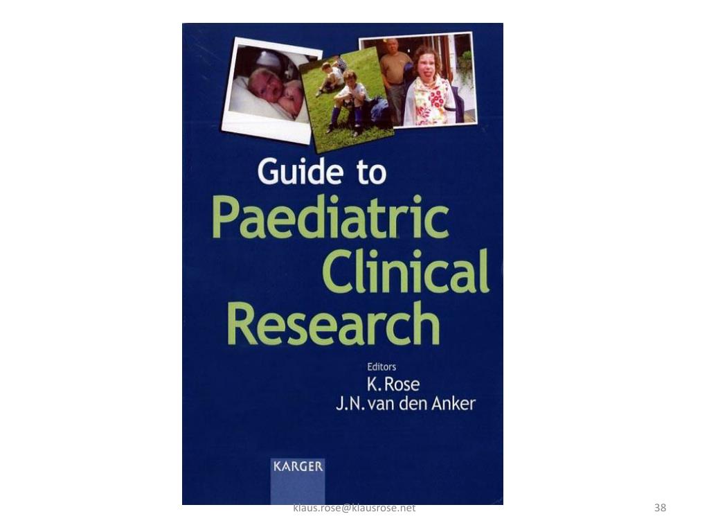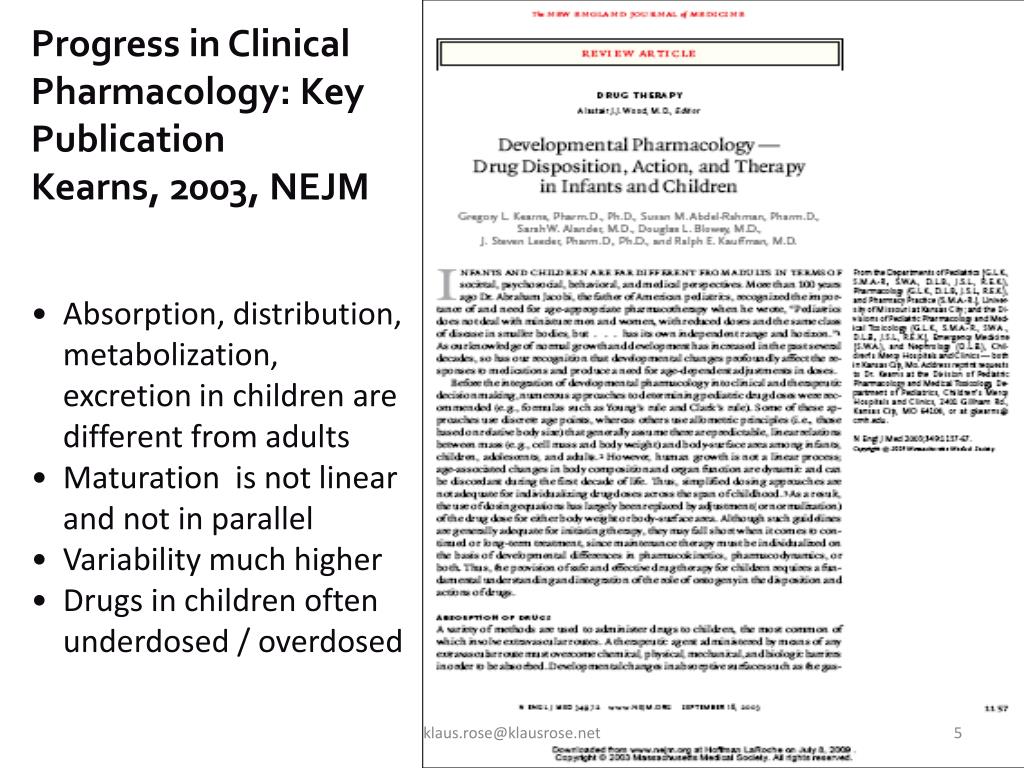 Progress in Clinical Pharmacology: Key Publication Kearns, 2003, NEJM • Absorption, distribution, metabolization, excretion in childrenare different fromadults • Maturationis not linear and not in parallel • Variabilitymuchhigher • Drugs in childrenoftenunderdosed / overdosed klaus.rose@klausrose.net