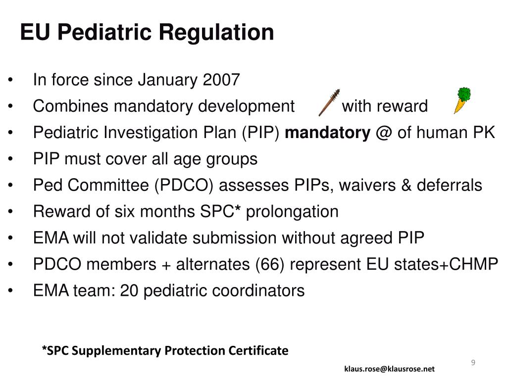 EU Pediatric Regulation • In force sinceJanuary 2007 • Combines mandatorydevelopmentwithreward • Pediatric Investigation Plan (PIP) mandatory@ of human PK • PIP must cover all age groups • PedCommittee (PDCO) assessesPIPs, waivers & deferrals • Reward of six months SPC*prolongation • EMA will not validatesubmissionwithoutagreed PIP • PDCO members + alternates (66) represent EU states+CHMP • EMA team: 20 pediatriccoordinators • *SPC Supplementary Protection Certificate klaus.rose@klausrose.net