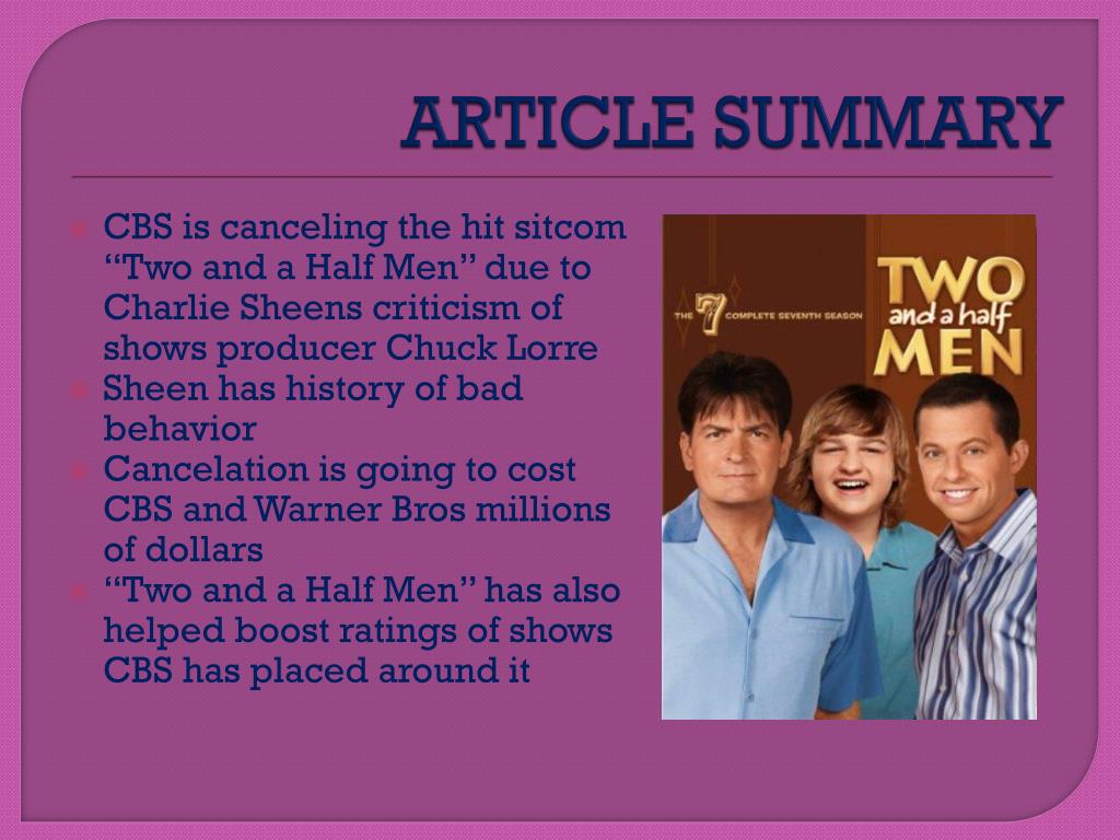 ARTICLE SUMMARY CBS is canceling the hit sitcom “Two and a Half Men” due to Charlie Sheens criticism of shows producer Chuck Lorre Sheen has history of bad behavior Cancelation is going to cost CBS and Warner Bros millions of dollars “Two and a Half Men” has also helped boost ratings of shows CBS has placed around it
