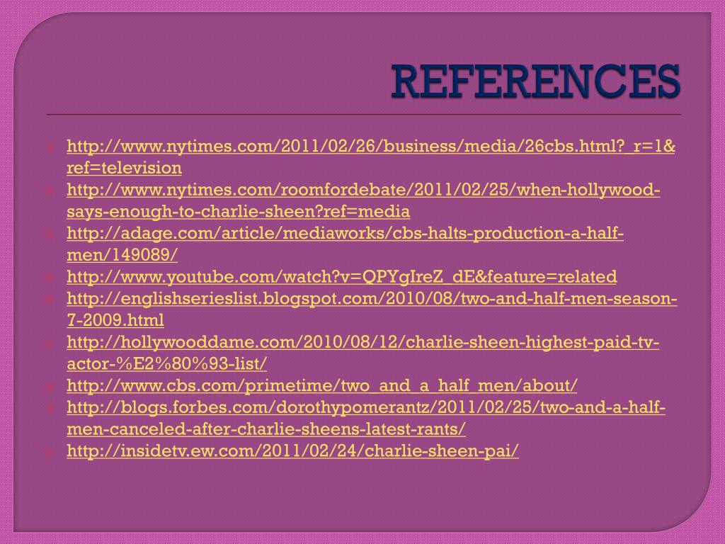 REFERENCES http://www.nytimes.com/2011/02/26/business/media/26cbs.html?_r=1&ref=television http://www.nytimes.com/roomfordebate/2011/02/25/when-hollywood-says-enough-to-charlie-sheen?ref=media http://adage.com/article/mediaworks/cbs-halts-production-a-half-men/149089/ http://www.youtube.com/watch?v=QPYgIreZ_dE&feature=related http://englishserieslist.blogspot.com/2010/08/two-and-half-men-season-7-2009.html http://hollywooddame.com/2010/08/12/charlie-sheen-highest-paid-tv-actor-%E2%80%93-list/ http://www.cbs.com/primetime/two_and_a_half_men/about/ http://blogs.forbes.com/dorothypomerantz/2011/02/25/two-and-a-half-men-canceled-after-charlie-sheens-latest-rants/ http://insidetv.ew.com/2011/02/24/charlie-sheen-pai/