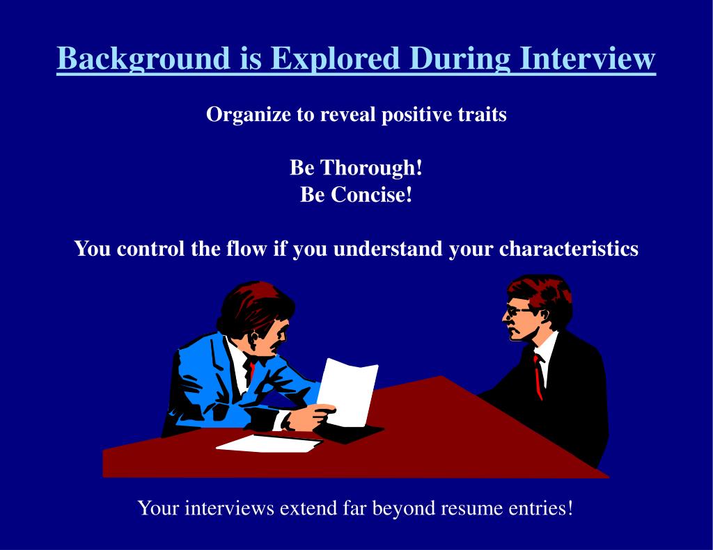 Background is Explored During Interview Organize to reveal positive traits Be Thorough! Be Concise! You control the flow if you understand your characteristics Your interviews extend far beyond resume entries!