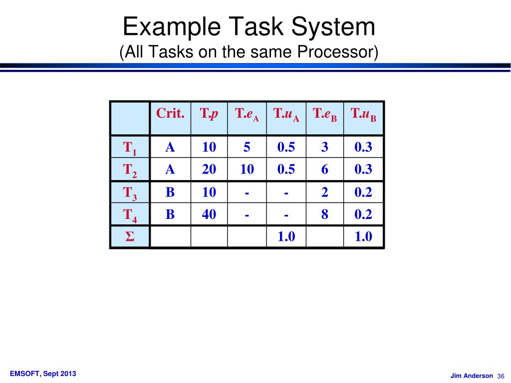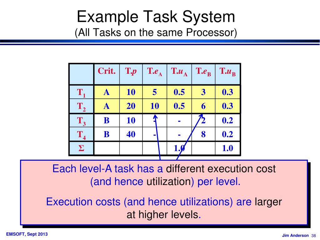Example Task System(All Tasks on the same Processor) Each level-A task has a different execution cost (and hence utilization) per level. Execution costs (and hence utilizations) are larger at higher levels.