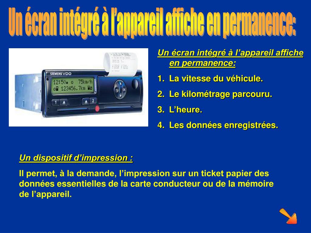 Un écran intégré à l’appareil affiche en permanence: • Un écran intégré à l’appareil affiche en permanence: • La vitesse du véhicule. • Le kilométrage parcouru. • L’heure. • Les données enregistrées. Un dispositif d’impression : Il permet, à la demande, l’impression sur un ticket papier des données essentielles de la carte conducteur ou de la mémoire de l’appareil.
