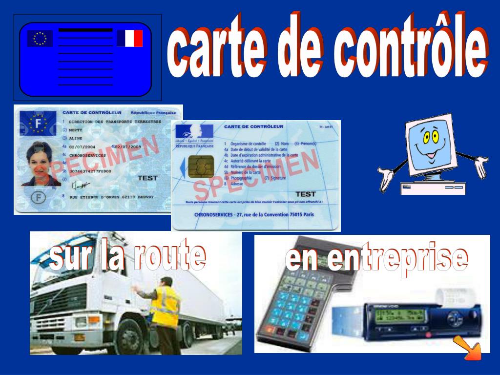 délivrance de la carte suite! • La signature du conducteur. • Une copie du permis de conduire. • Une copie de la carte d’identité,du passeport ou du titre de séjour. • Une déclaration sur l’honneur de résidence en France. • L’acquittement du droit d’usage • Le choix pour le retrait de la carte (au guichet de chrono services ou expédier par la poste en recommandé • Le formulaire sera à adresser à: • Chrono services • Centre de gestion BP 61 59502 Douai La carte ne lui appartiendra pas,il en aura un droit d’usage La carte est valable pour 5 ans. On pourra commander une nouvelle carte en cas de perte, de vol ou de détérioration Les activités du conducteur seront enregistrés