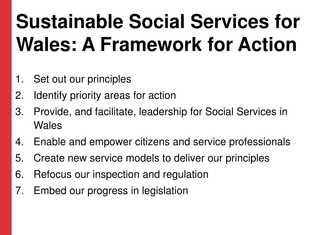 Sustainable Social Services for Wales: A Framework for Action • Set out our principles • Identify priority areas for action • Provide, and facilitate, leadership for Social Services in Wales • Enable and empower citizens and service professionals • Create new service models to deliver our principles • Refocus our inspection and regulation • Embed our progress in legislation