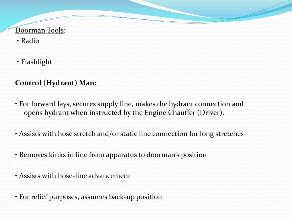 Doorman Tools: • Radio • Flashlight Control (Hydrant) Man: • For forward lays, secures supply line, makes the hydrant connection and opens hydrant when instructed by the Engine Chauffer (Driver). • Assists with hose stretch and/or static line connection for long stretches • Removes kinks in line from apparatus to doorman’s position • Assists with hose-line advancement • For relief purposes, assumes back-up position