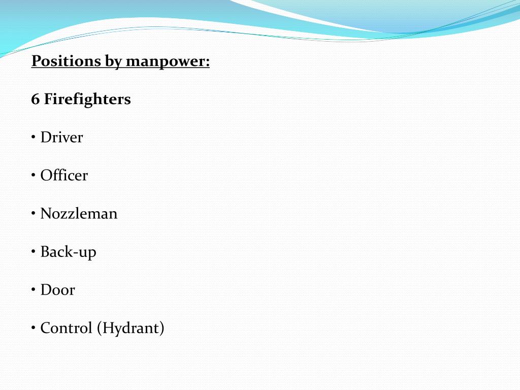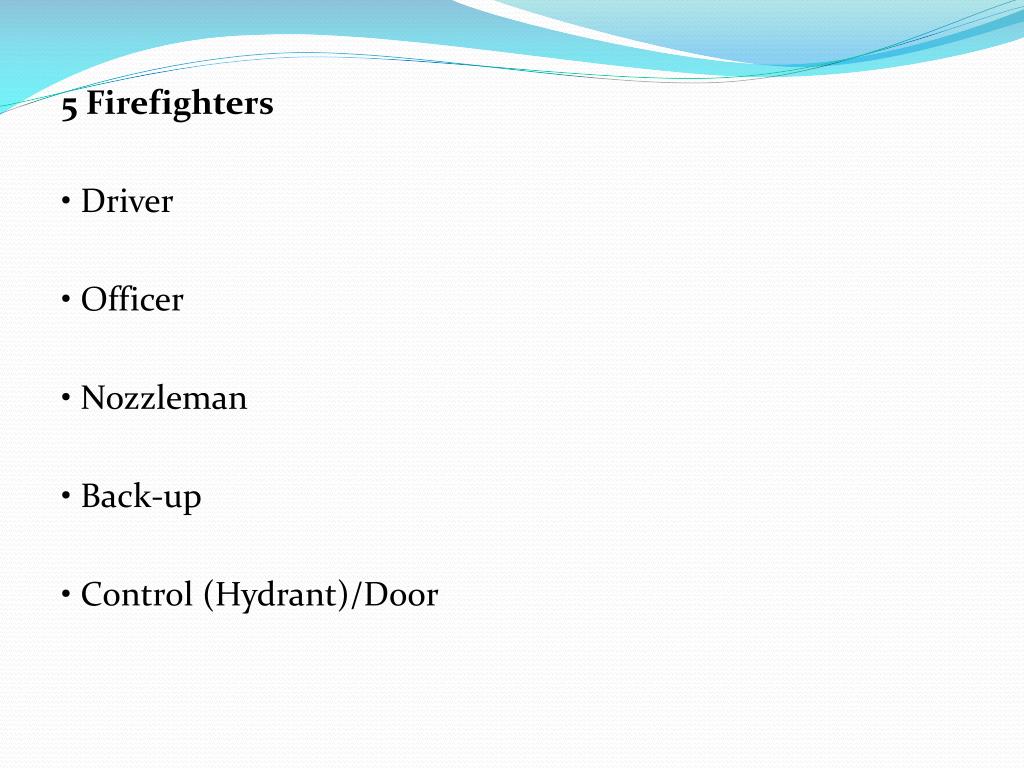 5 Firefighters • Driver • Officer • Nozzleman • Back-up • Control (Hydrant)/Door