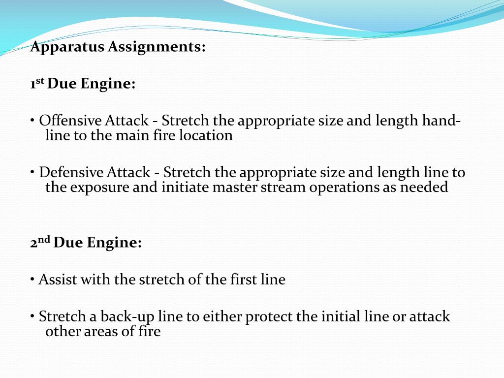 Apparatus Assignments: 1st Due Engine: • Offensive Attack - Stretch the appropriate size and length hand-line to the main fire location • Defensive Attack - Stretch the appropriate size and length line to the exposure and initiate master stream operations as needed 2nd Due Engine: • Assist with the stretch of the first line • Stretch a back-up line to either protect the initial line or attack other areas of fire