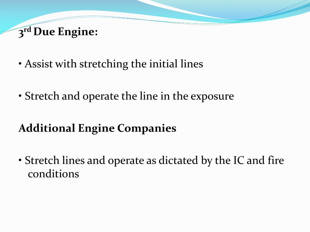 3rd Due Engine: • Assist with stretching the initial lines • Stretch and operate the line in the exposure Additional Engine Companies • Stretch lines and operate as dictated by the IC and fire conditions