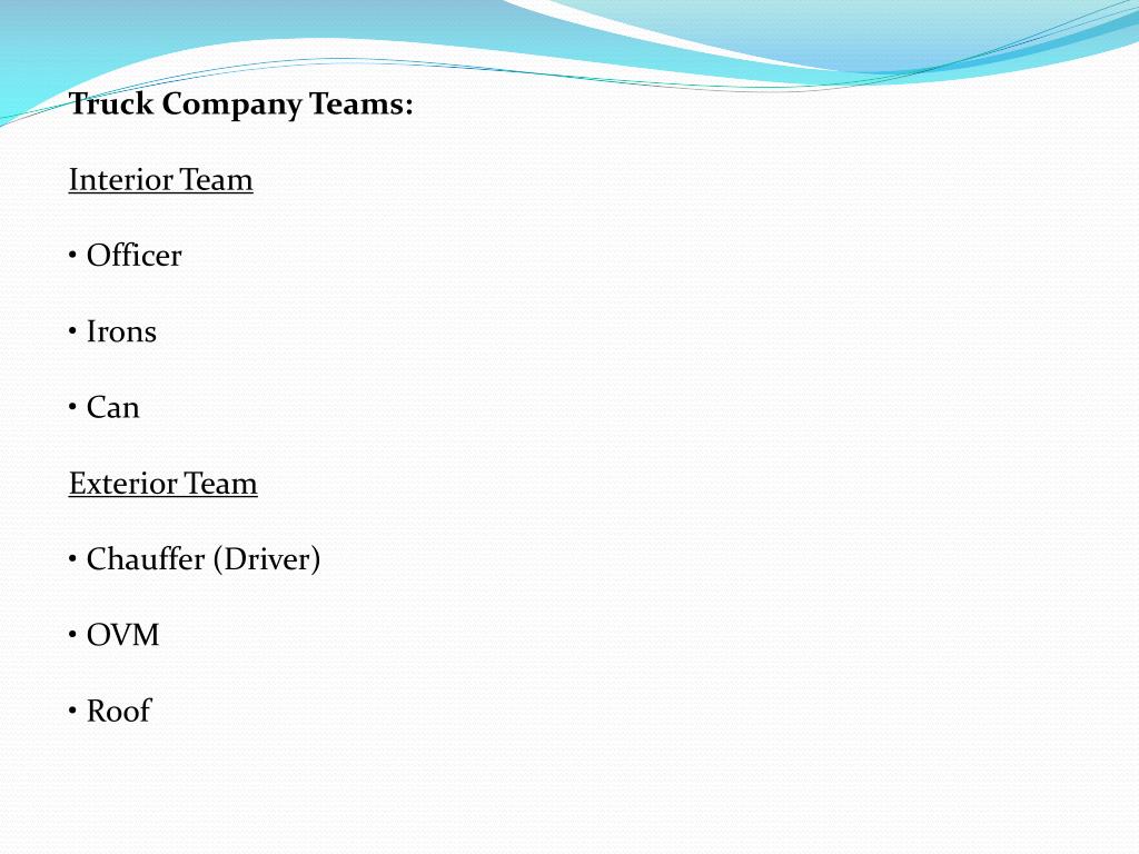 Truck Company Teams: Interior Team • Officer • Irons • Can Exterior Team • Chauffer (Driver) • OVM • Roof