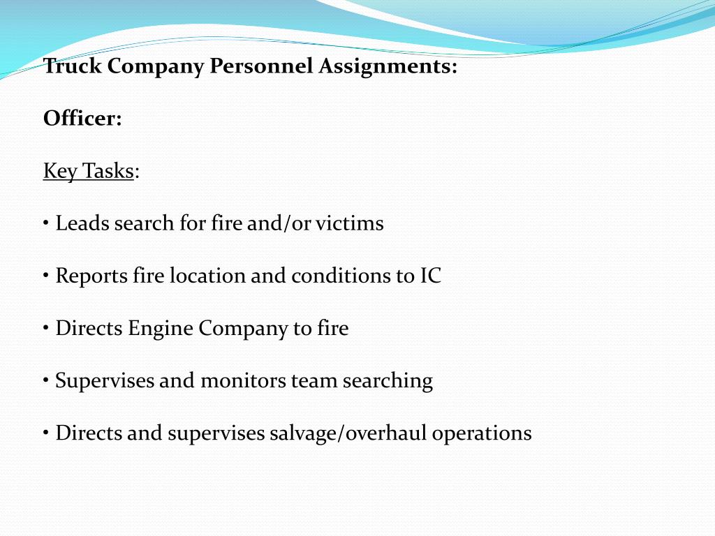 Truck Company Personnel Assignments: Officer: Key Tasks: • Leads search for fire and/or victims • Reports fire location and conditions to IC • Directs Engine Company to fire • Supervises and monitors team searching • Directs and supervises salvage/overhaul operations