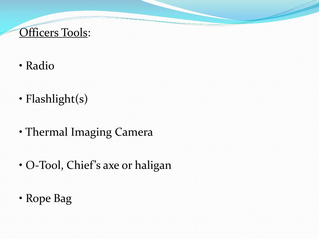 Officer Tools: • Radio • Thermal Imaging Camera • Officer’s Tool or set of irons (if no Truck Company present) • Flashlight