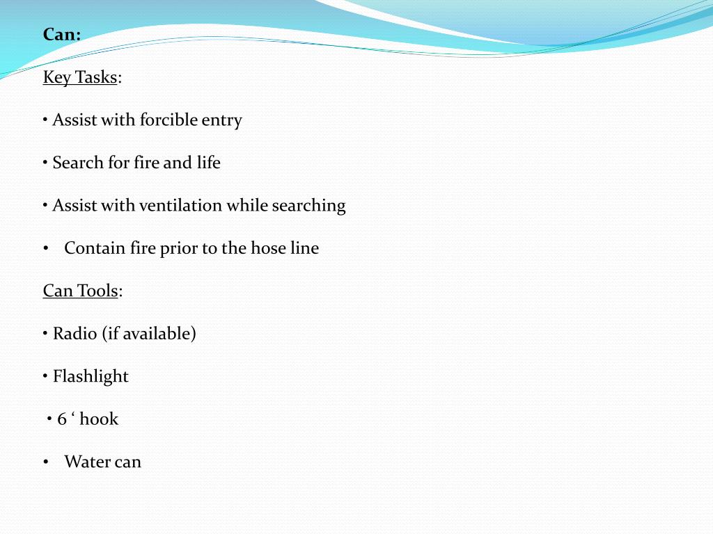 Can: Key Tasks: • Assist with forcible entry • Search for fire and life • Assist with ventilation while searching • Contain fire prior to the hose line Can Tools: • Radio (if available) • Flashlight • 6 ‘ hook • Water can
