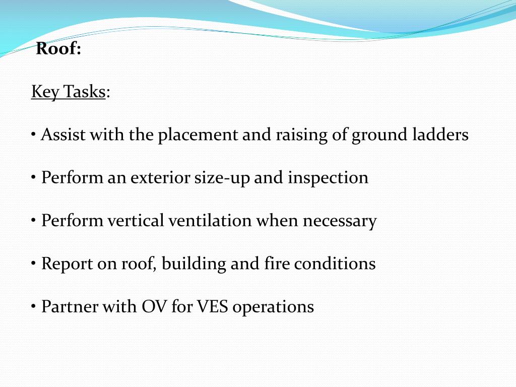 Roof: Key Tasks: • Assist with the placement and raising of ground ladders • Perform an exterior size-up and inspection • Perform vertical ventilation when necessary • Report on roof, building and fire conditions • Partner with OV for VES operations