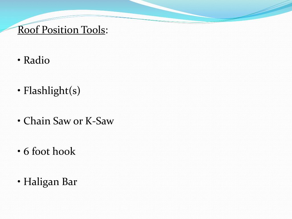 Roof Position Tools: • Radio • Flashlight(s) • Chain Saw or K-Saw • 6 foot hook • Haligan Bar