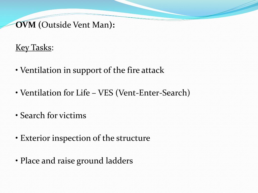 OVM (Outside Vent Man): Key Tasks: • Ventilation in support of the fire attack • Ventilation for Life – VES (Vent-Enter-Search) • Search for victims • Exterior inspection of the structure • Place and raise ground ladders