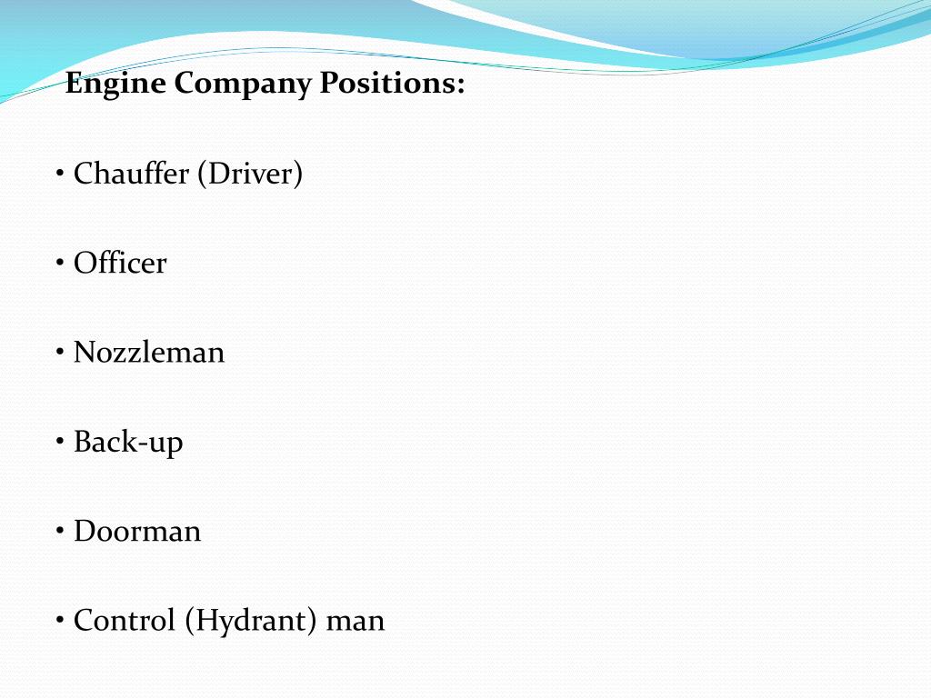 Engine Company Positions: • Chauffer (Driver) • Officer • Nozzleman • Back-up • Doorman • Control (Hydrant) man