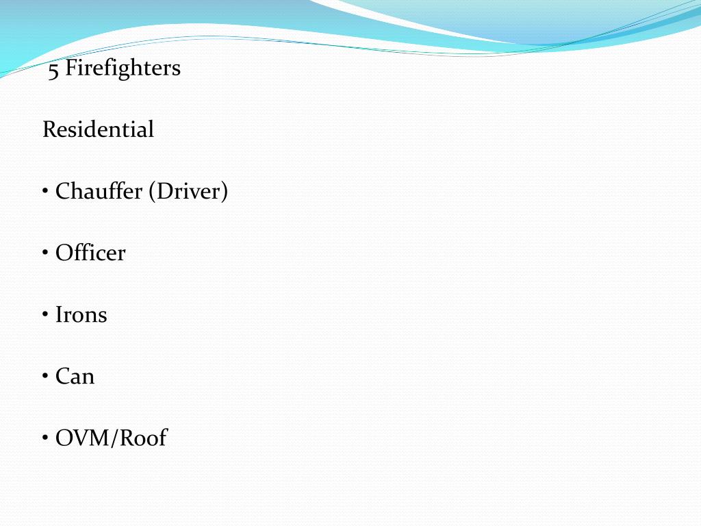 5 Firefighters Residential • Chauffer (Driver) • Officer • Irons • Can • OVM/Roof