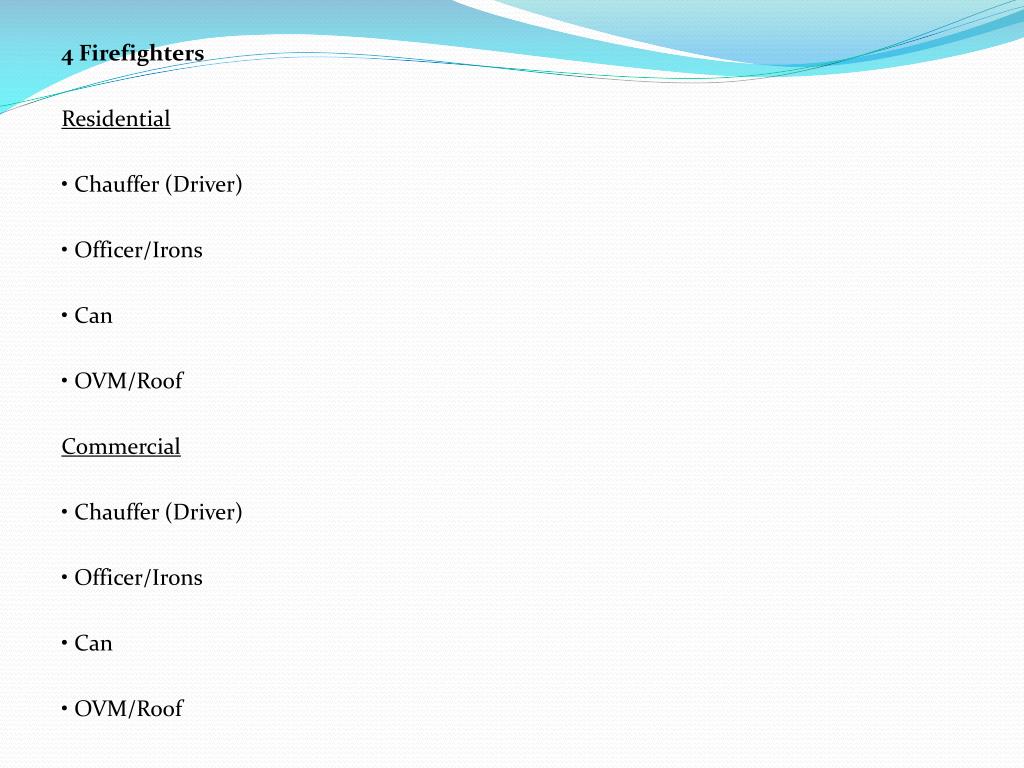 4 Firefighters Residential • Chauffer (Driver) • Officer/Irons • Can • OVM/Roof Commercial • Chauffer (Driver) • Officer/Irons • Can • OVM/Roof