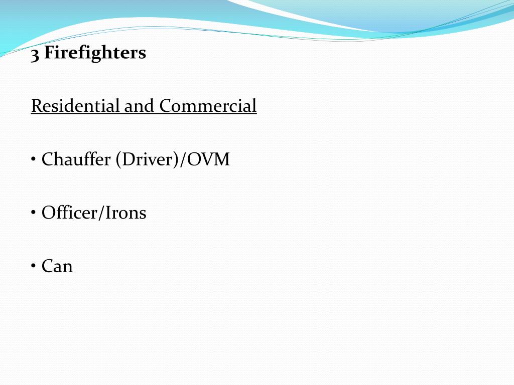 3 Firefighters Residential and Commercial • Chauffer (Driver)/OVM • Officer/Irons • Can