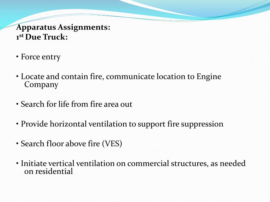 Apparatus Assignments: 1st Due Truck: • Force entry • Locate and contain fire, communicate location to Engine Company • Search for life from fire area out • Provide horizontal ventilation to support fire suppression • Search floor above fire (VES) • Initiate vertical ventilation on commercial structures, as needed on residential