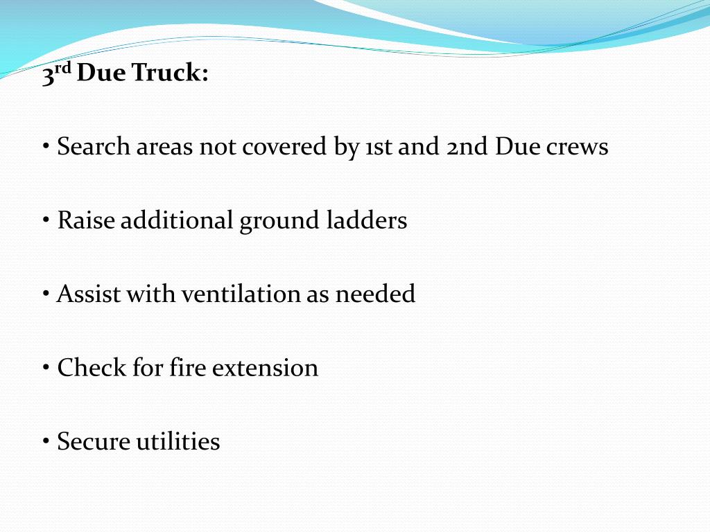 3rd Due Truck: • Search areas not covered by 1st and 2nd Due crews • Raise additional ground ladders • Assist with ventilation as needed • Check for fire extension • Secure utilities