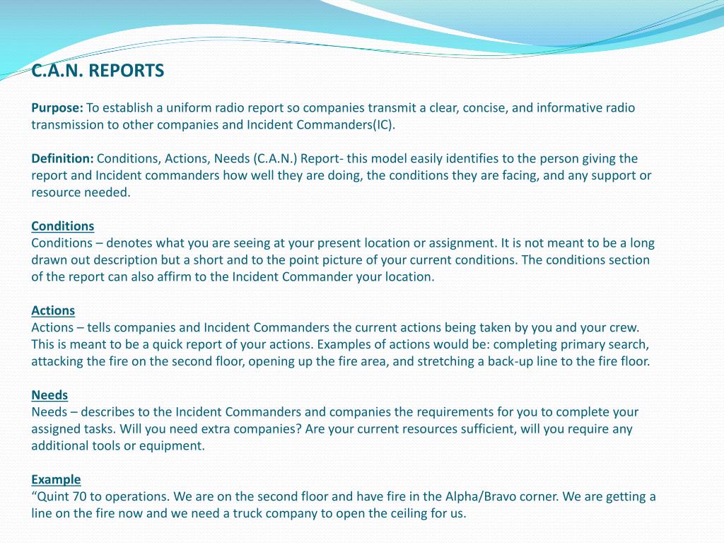C.A.N. REPORTSPurpose: To establish a uniform radio report so companies transmit a clear, concise, and informative radio transmission to other companies and Incident Commanders(IC).Definition: Conditions, Actions, Needs (C.A.N.) Report- this model easily identifies to the person giving the report and Incident commanders how well they are doing, the conditions they are facing, and any support or resource needed.ConditionsConditions – denotes what you are seeing at your present location or assignment. It is not meant to be a long drawn out description but a short and to the point picture of your current conditions. The conditions section of the report can also affirm to the Incident Commander your location.ActionsActions – tells companies and Incident Commanders the current actions being taken by you and your crew. This is meant to be a quick report of your actions. Examples of actions would be: completing primary search, attacking the fire on the second floor, opening up the fire area, and stretching a back-up line to the fire floor.NeedsNeeds – describes to the Incident Commanders and companies the requirements for you to complete your assigned tasks. Will you need extra companies? Are your current resources sufficient, will you require any additional tools or equipment. Example“Quint 70 to operations. We are on the second floor and have fire in the Alpha/Bravo corner. We are getting a line on the fire now and we need a truck company to open the ceiling for us.