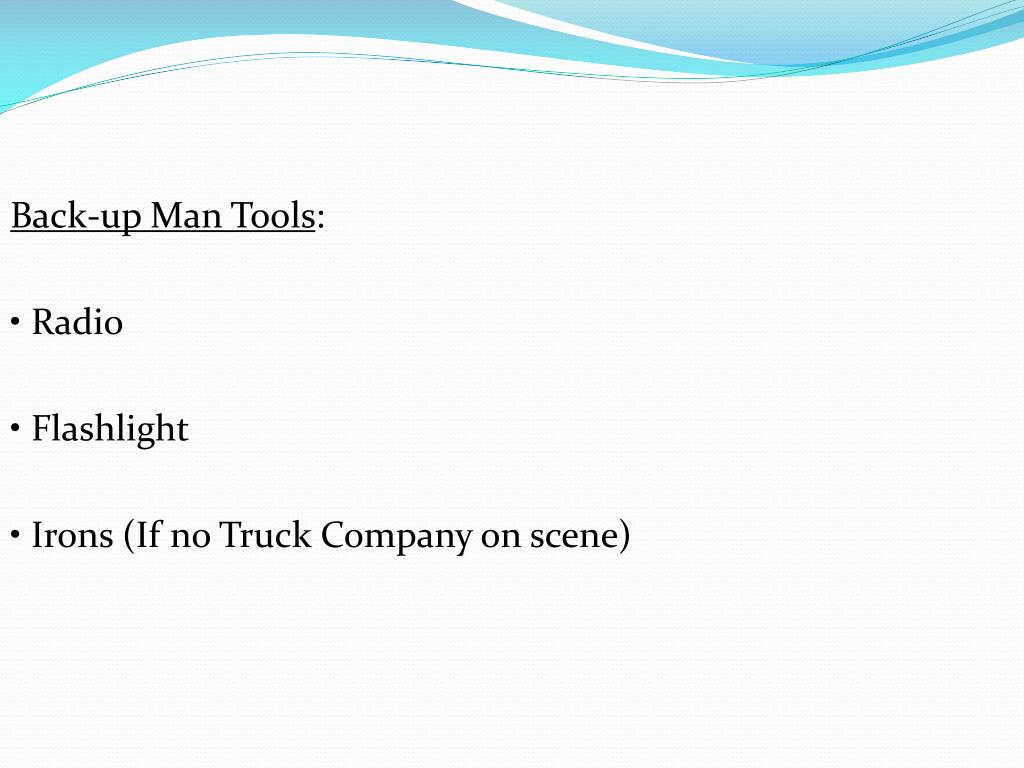 Back-up Man Tools: • Radio • Flashlight • Irons (If no Truck Company on scene)