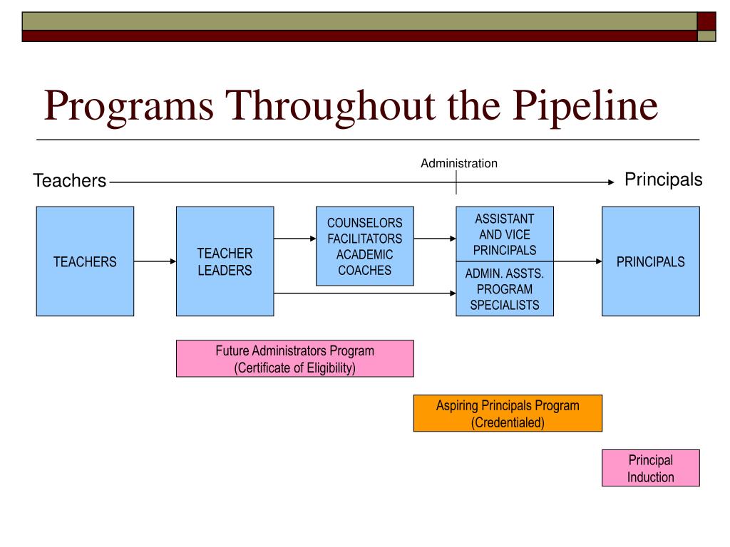 Administration ASSISTANT AND VICE PRINCIPALS Principals Teachers ADMIN. ASSTS. PROGRAM SPECIALISTS Programs Throughout the Pipeline TEACHERS TEACHER LEADERS COUNSELORS FACILITATORS ACADEMIC COACHES PRINCIPALS Future Administrators Program (Certificate of Eligibility) Aspiring Principals Program (Credentialed) Principal Induction