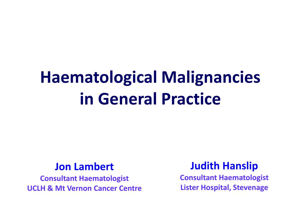 Haematological Malignanciesin General Practice Judith Hanslip Consultant Haematologist Lister Hospital, Stevenage Jon Lambert Consultant Haematologist UCLH & Mt Vernon Cancer Centre