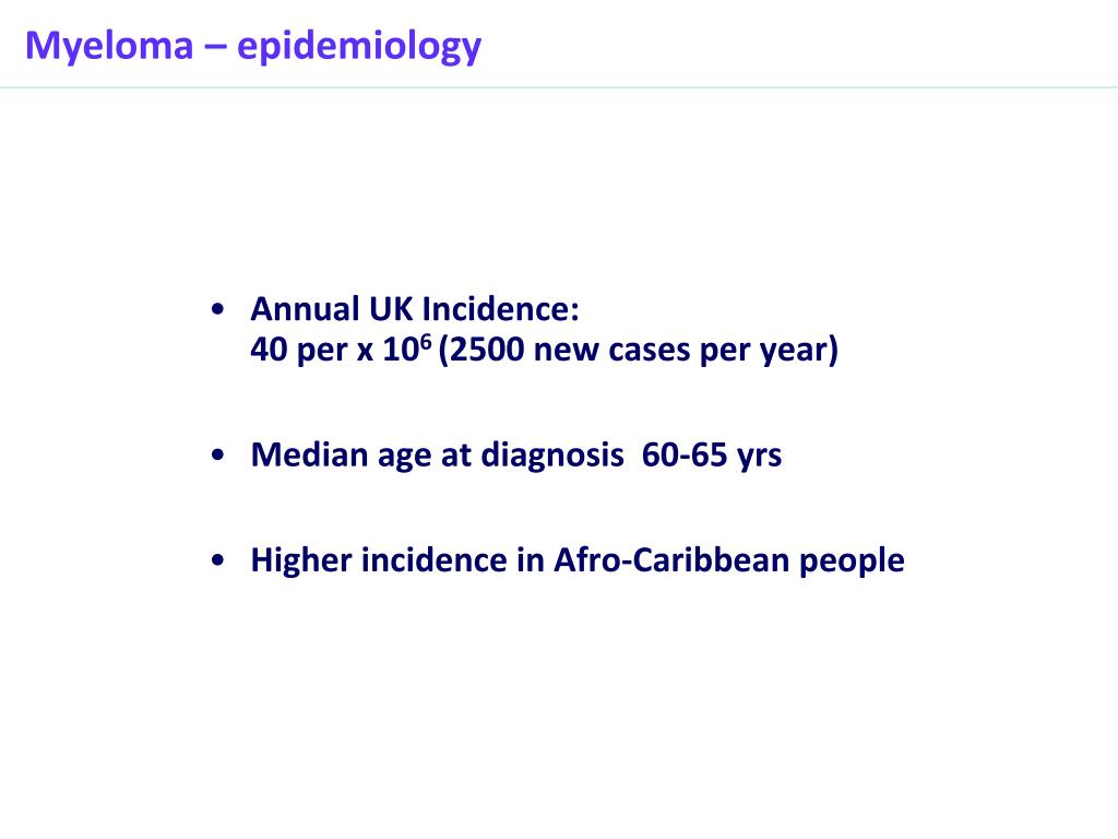 Myeloma – epidemiology • Annual UK Incidence: 40 per x 106 (2500 new cases per year) • Median age at diagnosis 60-65 yrs • Higher incidence in Afro-Caribbean people